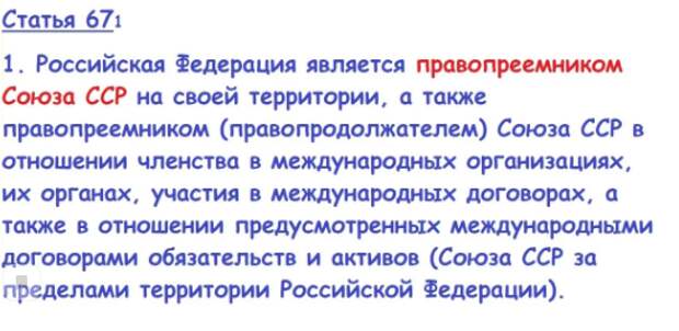Закрепляя в Конституции пункты Статьи 67 и Преамбулу - Российская Федерация (Россия) заявляет, что она де юре и есть СССР.