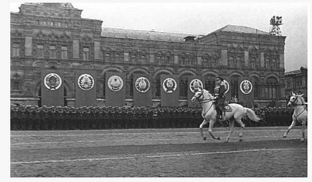 За неделю до дня парада Сталин вызвал Жукова к себе на дачу и спросил, не разучился ли маршал ездить верхом. Ему-то всё больше на штабных автомобилях приходится ездить. Жуков ответил, что не разучился и в свободную минуту старается ездить верхом.– Вот что, – сказал верховный, – вам придется принимать Парад Победы. Командовать парадом будет Рокоссовский.